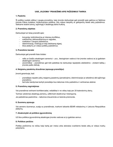 UAB „VILDOMA“ PRANEŠIMO APIE PAŽEIDIMUS